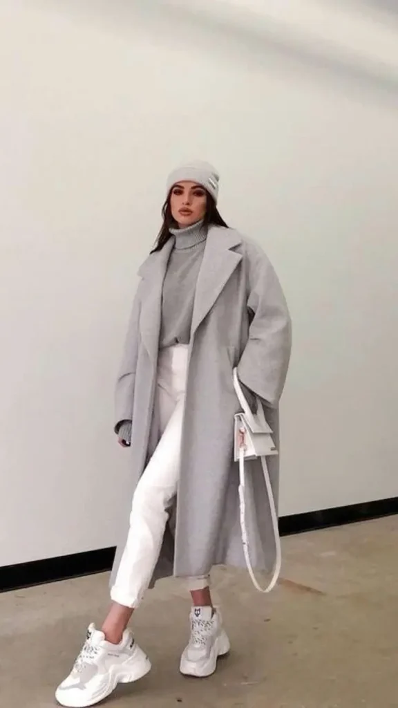 بارانی بلند سرمهای یا کرمی با بوتهای چرمی ضدآب و شال موهر گرم بهترین گزینه است. هم کاربردی است، هم ظاهر شما را منظم و شیک نشان میدهد.