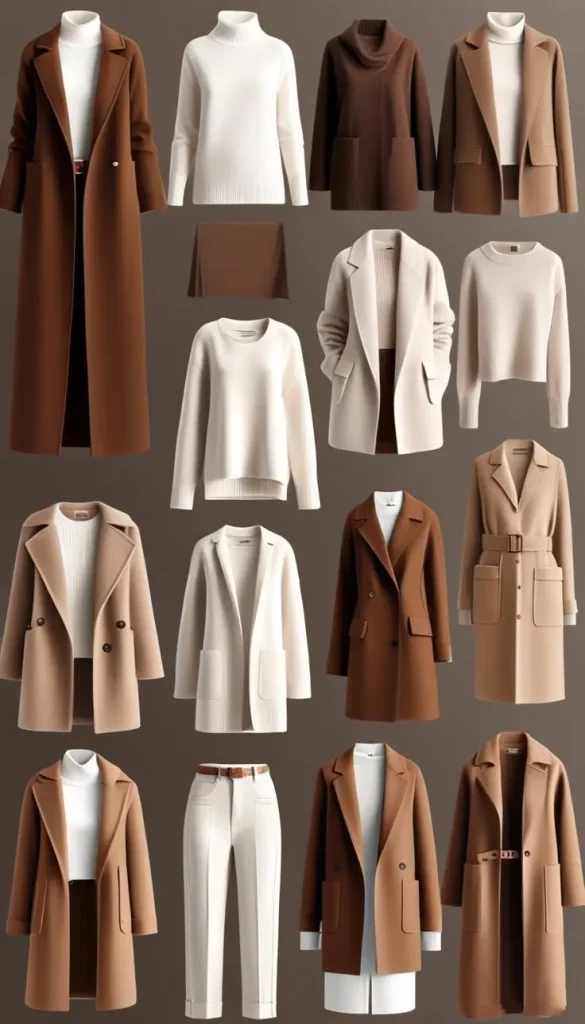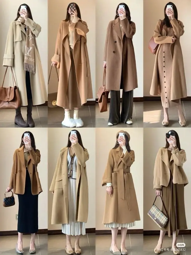 ست پالتوی شتری با بلوز یقهاسکی سفید، شلوار جین آبی و شال موهر زرشکی یکی از محبوبترین ترکیبهاست. همچنین رنگ کرمی در کنار سبز زیتونی یا قهوهای روشن جلوهای گرم و چشمنواز میسازد.